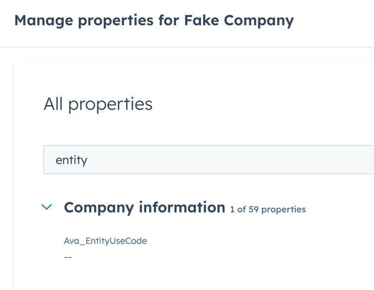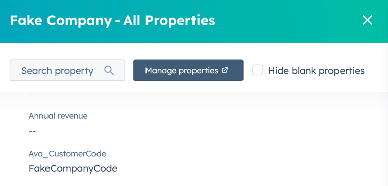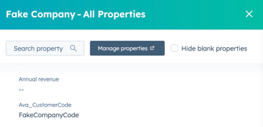 And if needed, you can use a custom HubSpot Company identifier. Go to the company record, click on Actions, then View All Properties and then search for 'Ava_CustomerCode'. There you can input a custom identifier that will get used as that company's AvaTax Customer Code.