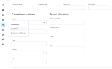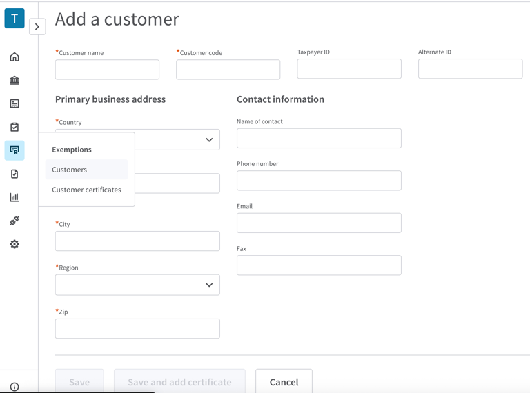 Copy the HubSpot Company ID, then go to your AvaTax console, under Exemptions, and add a new customer. You'll input the Company Name, along with the Customer Code (the HubSpot Company ID), then hit 'Save and add certificate' to provide the specific certificate information so AvaTax knows