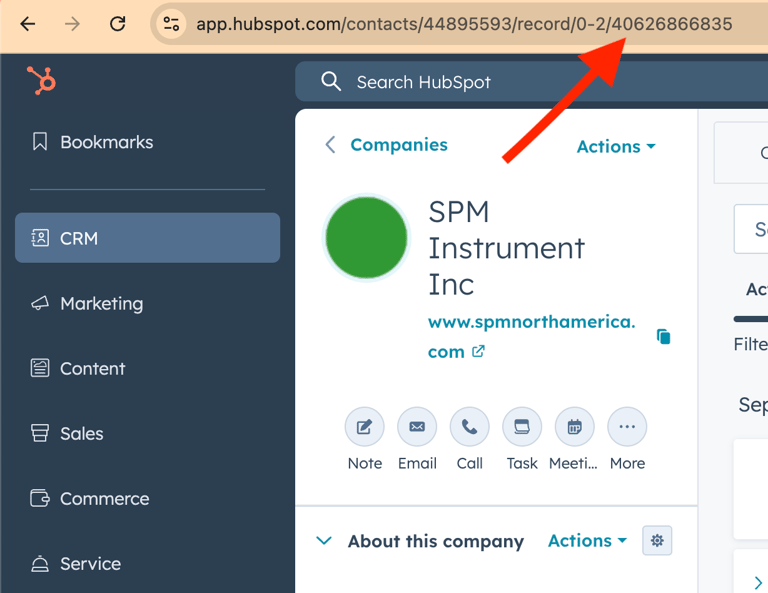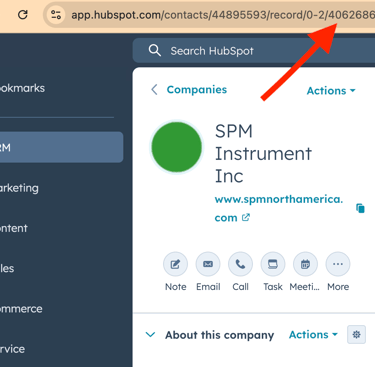 Start by finding the HubSpot Company ID. When you open their Company account record in HubSpot, the HubSpot Company ID is in the address bar, as pictured below.